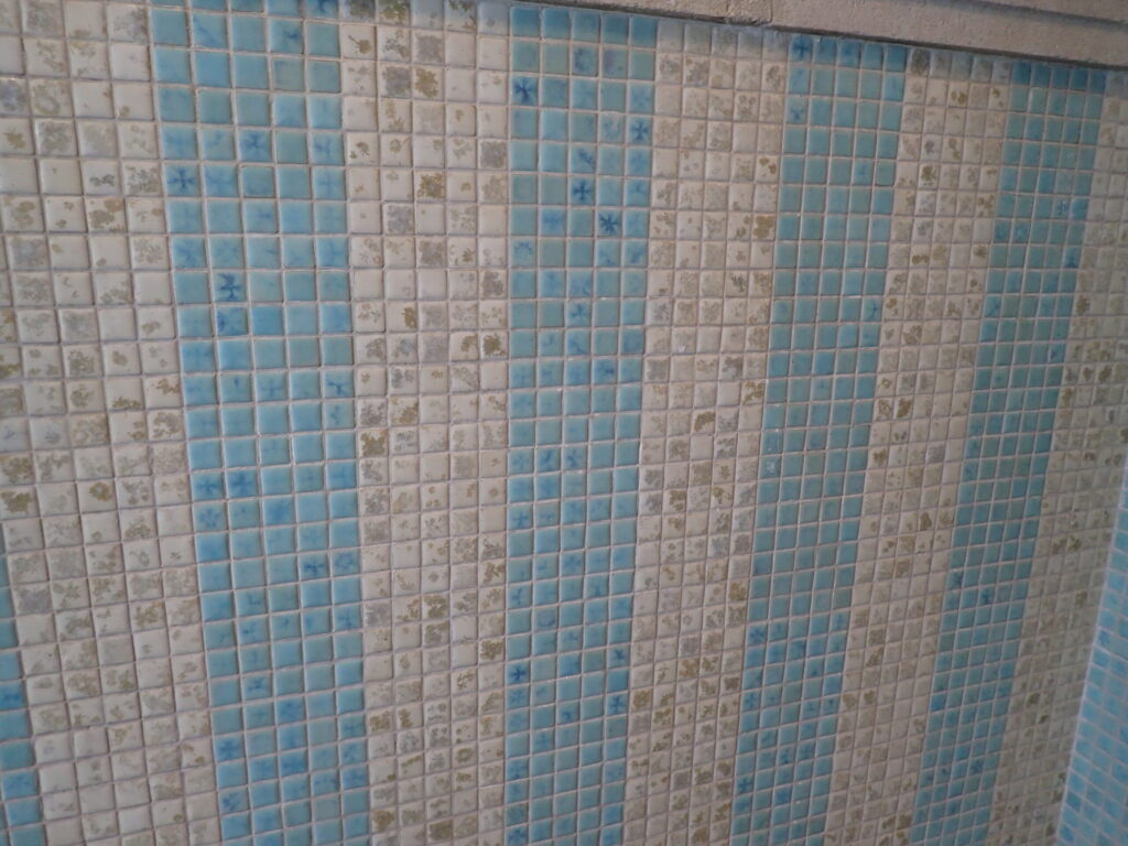 小さいですが多くのタイルに“よごれ”のようなものがついています。「結晶釉」と呼ばれ,釉薬中の物質が結晶化したもので,花の形に見えるものもあります。